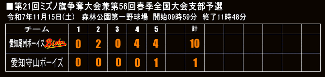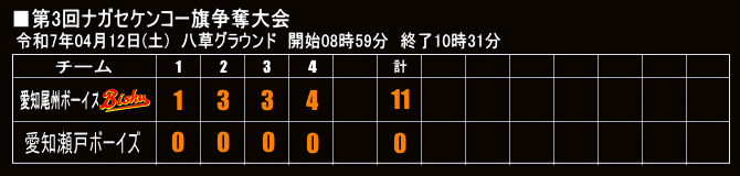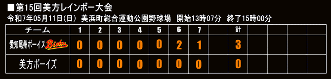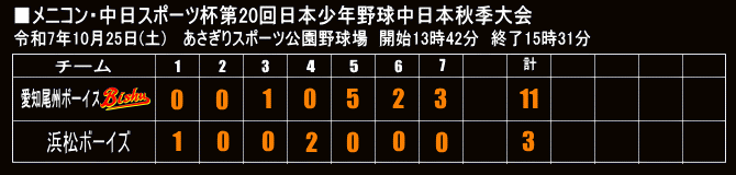 | 2025年06月28日 二回戦 いこいグラウンド 愛知尾州ボーイズ〇 11 - 4 豊川中央ボーイズ |