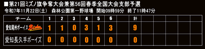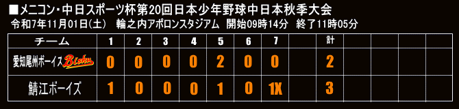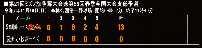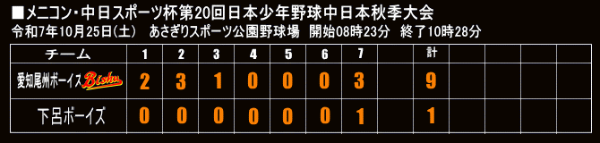 | 2025年06月29日 準々決勝 西尾ボーイズグラウンド 愛知尾州ボーイズ〇 6 - 0 名古屋中央ボーイズ |