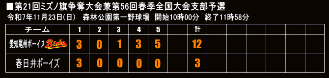 | 2025年06月29日 三回戦 西尾ボーイズグラウンド 愛知尾州ボーイズ〇 10 - 5 春日井ボーイズ |